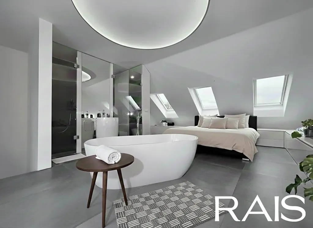 Interiér bytu je navržen s důrazem na funkčnost a elegantní design. V bytě naleznete dvě samostatné toalety a dva sprchové kouty, doplněné o vanu umístěnou volně v prostoru, což vytváří atmosféru lázní. Koupelna je osvětlena pomocí moderního napínaného stropu Barisol, který zajišťuje dokonale hladký povrch a rovnoměrné rozptýlené světlo a je odolný vůči vlhkosti.