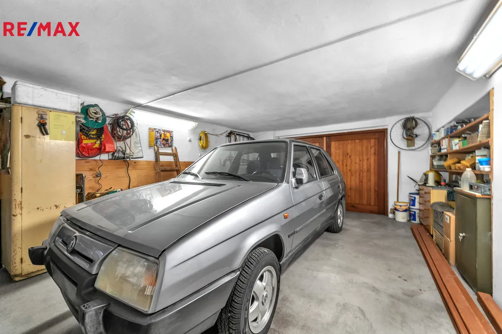 Na zahradě je další garáž s prostorem pro zahradní techniku a dílnu. Tento objekt je částečně podsklepen.
