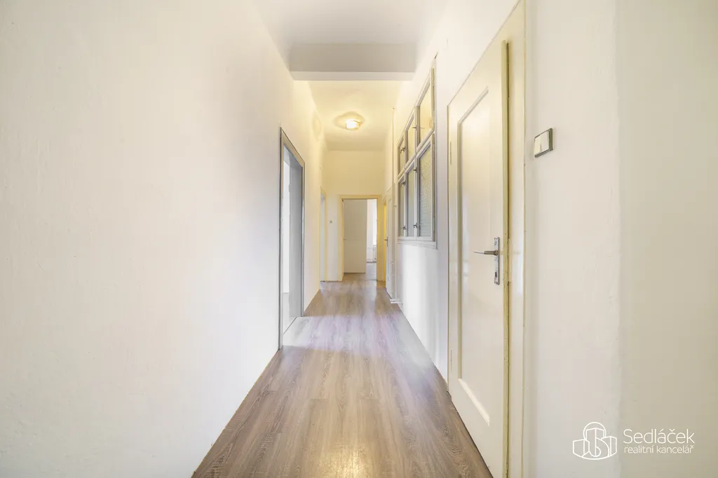 Atmosféru bytu podtrhují původní dřevěné obložky, vysoké stropy a okna v chodbě do světlíku domu, která navozují velmi příjemnou atmosféru. Prostor má charakter, který se dnes už často nevidí.