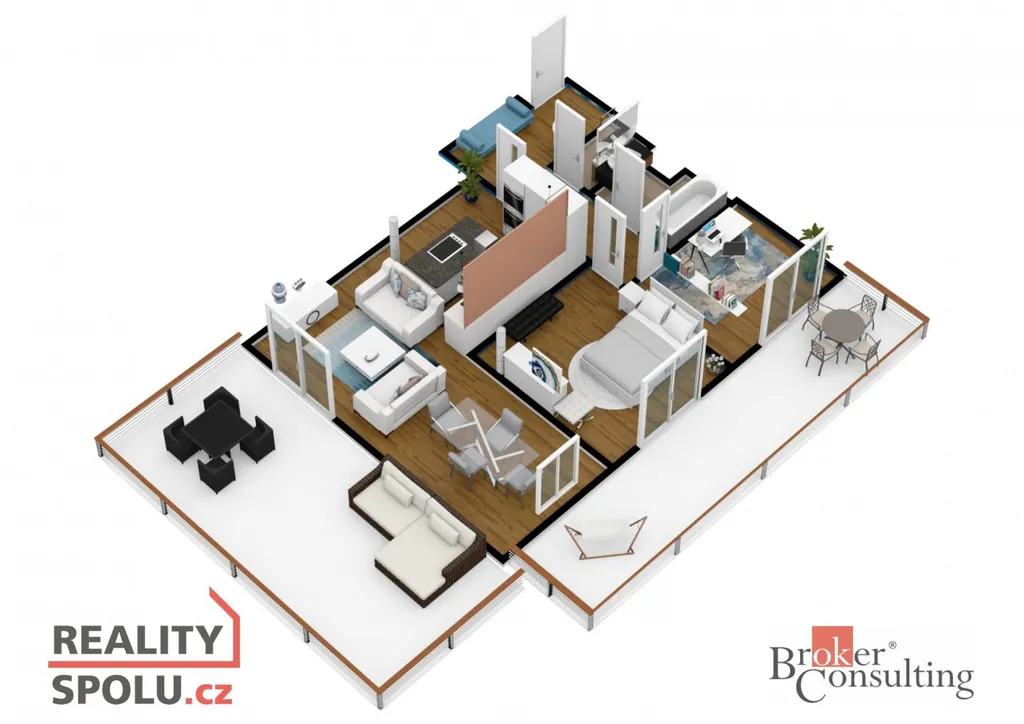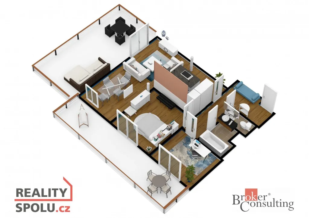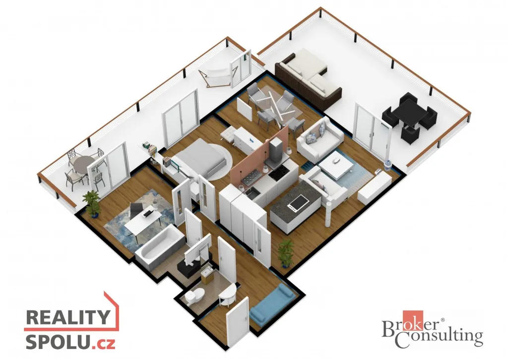 Plocha bytu je 76 m2, terasa má 35m2, balkon 12m2. Současné dispoziční uspořádání bytu nabízí obývací pokoj s otevřenou kuchyní, jídelnou a přístupem na velkou terasu s krásným výhledem do zeleně, hlavní ložnici s další menší terasou a druhou ložnicí, koupelnu, wc.