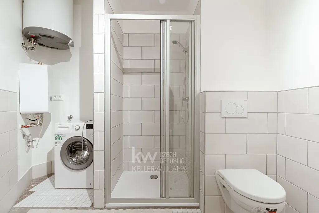 Kuchyně je vybavena kuchyňskou linkou a spotřebiči včetně lednice, myčky, trouby a varné desky. V koupelně je sprchový kout a k dispozici je pračka. WC je samostatné. K bytu náleží sklep.