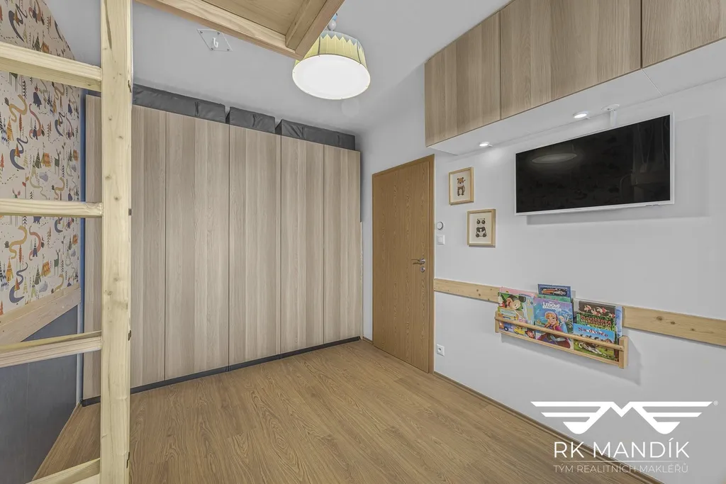 Obývací pokoj spolu s kuchyňským koutem (28,01 m²), který skýtá vestavěné spotřebiče (varná deska, digestoř, myčka nádobí, mikrovlnná trouba, elektrická trouba, kombinovaná lednice s mrazákem), nabízí dostatek prostoru, je vybaven jídelním koutem, pracovním koutem a praktickou vestavnou sklápěcí postelí. Dětský pokoj (12,67 m²) je prakticky řešen, úložný prostor zajišťuje šatní skříň, zbývá dostatek prostoru.