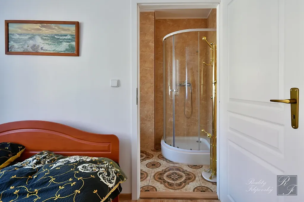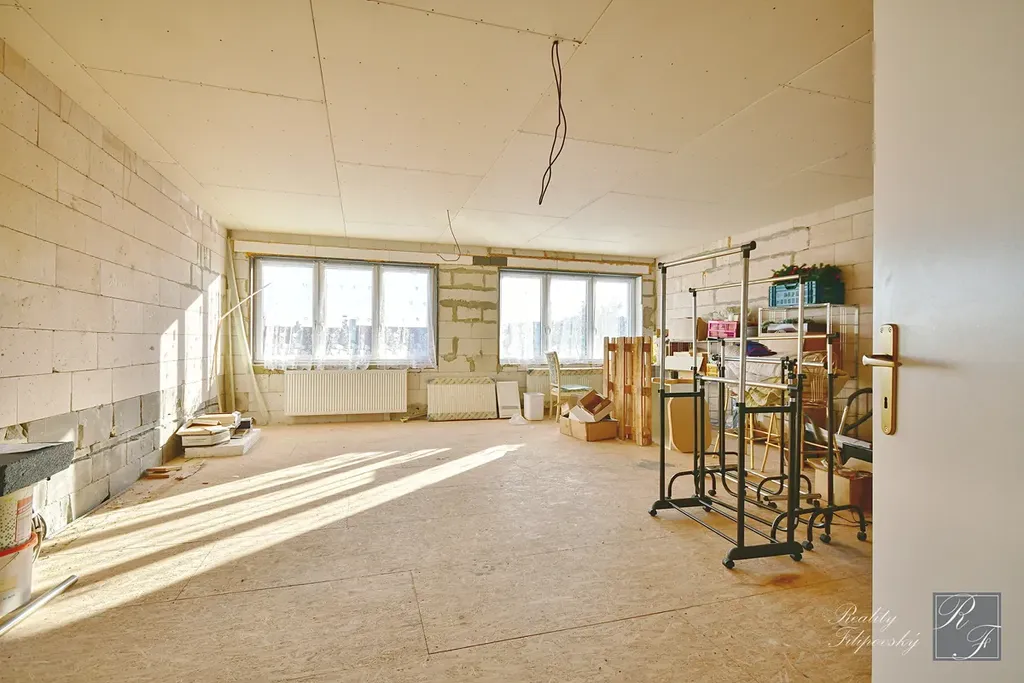 Ve 2. NP najdeme ložnici s koupelnou a toaletou a další místnost o výměře 43 m2, která je těsně před dokončením. Ta může sloužit jako dva samostatné pokoje, nebo jeden velký obytný prostor. Výhodou je, že 2. NP disponuje přípravou instalací pro kuchyňskou linku a dům tak může sloužit i k dvougeneračnímu bydlení, či ke kombinaci bydlení a pronájmu.