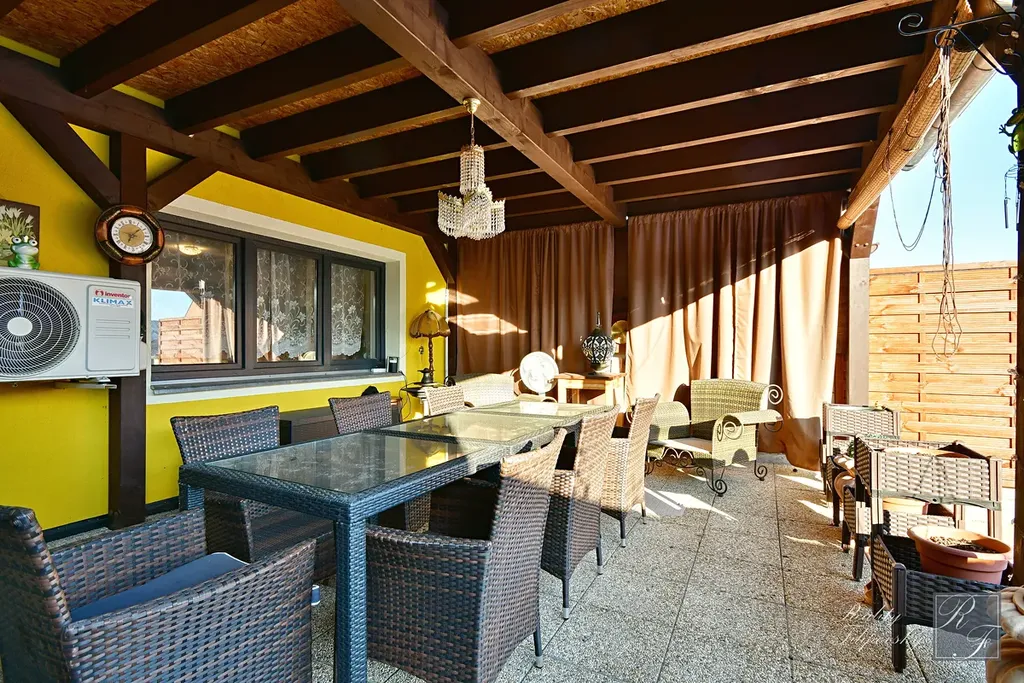 V 1. NP domu se nachází vstupní chodba, šatna, koupelna s toaletou a technickou místností, prostorný obývací pokoj s jídelnou kuchyní a vstupem na nádhernou terasu o výměře 28 m2. Konstrukce terasy tvoří současně zastřešení pergoly s posezením a vstupem na zahradu.