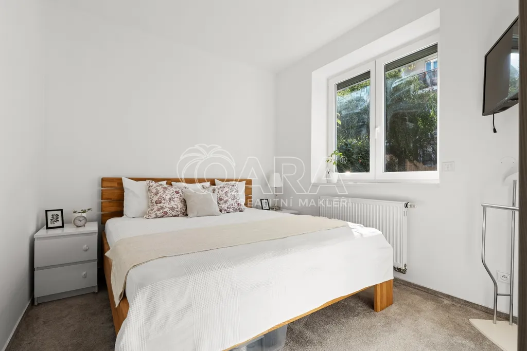 Byt má další 2 samostatné pokoje. Jeden je hlavní ložnicí – orientovanou do do větší zahrady a druhý je dětský pokoj orientovaný do ulice, na ten na ten navazuje druhá předzahrádka o velikosti 24 m². Koupelna prošla rekonstrukcí před čtyřmi lety a je vybavena rohovou vanou se sprchovou zástěnou a závěsným WC. Součástí je i komora v bytě a sklep hned vedle bytu.