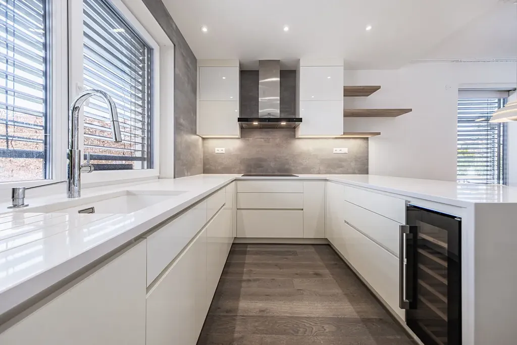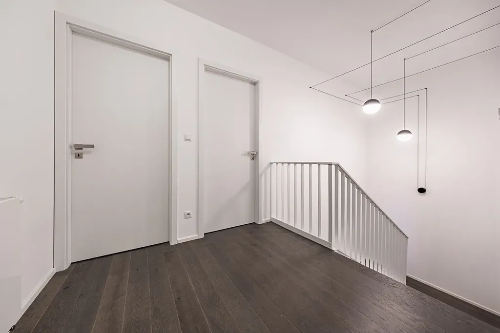Interiér domu je kompletně řešen na míru truhlářem – od vestavěných skříní, přes elegantní úložné prostory v každém koutě domu až po luxusní kuchyňskou linku s moderními technologiemi a vinotékou, která potěší i náročné milovníky vaření.