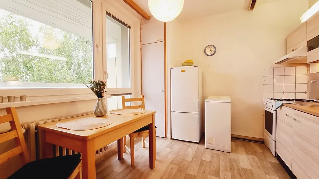 Kuchyně (10 m²) je zařízena kuchyňskou linkou s plynovým sporákem a troubou, kombinovanou lednicí, pračkou, spížovou skříní a jídelním stolem s židlemi.