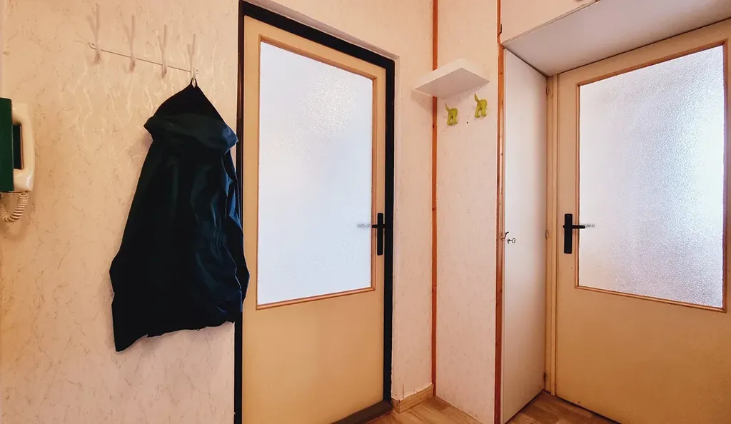 V chodbě (3 m²) jsou úložné prostory, věšáky, zrcadlo a intercom.