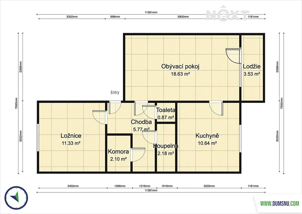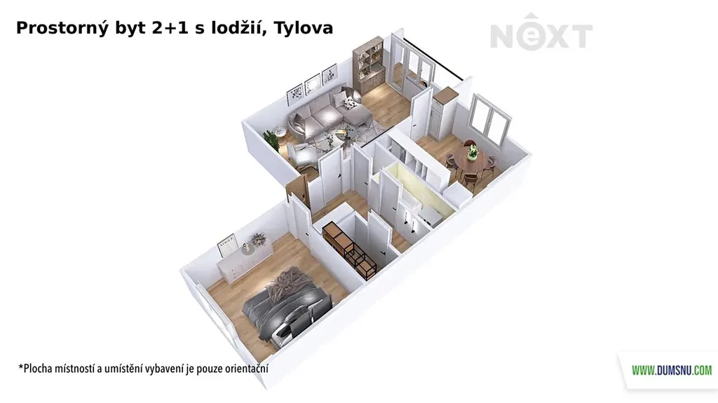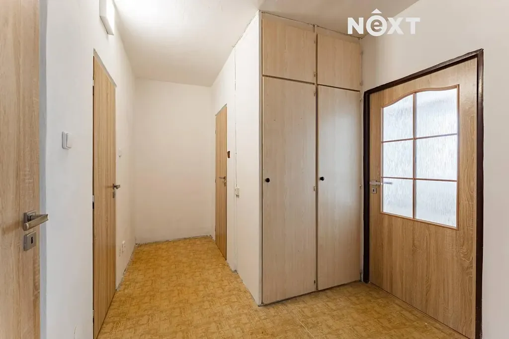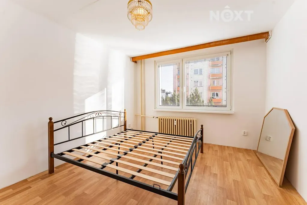 Dispozice bytu zahrnuje vstupní chodbu s praktickou komorou, ložnici, obývací pokoj se vstupem na lodžii, samostatnou kuchyni, menší koupelnu s vanou a oddělenou toaletu. Díky tomuto uspořádání nabízí byt dostatek úložného prostoru i komfortní bydlení.