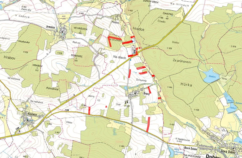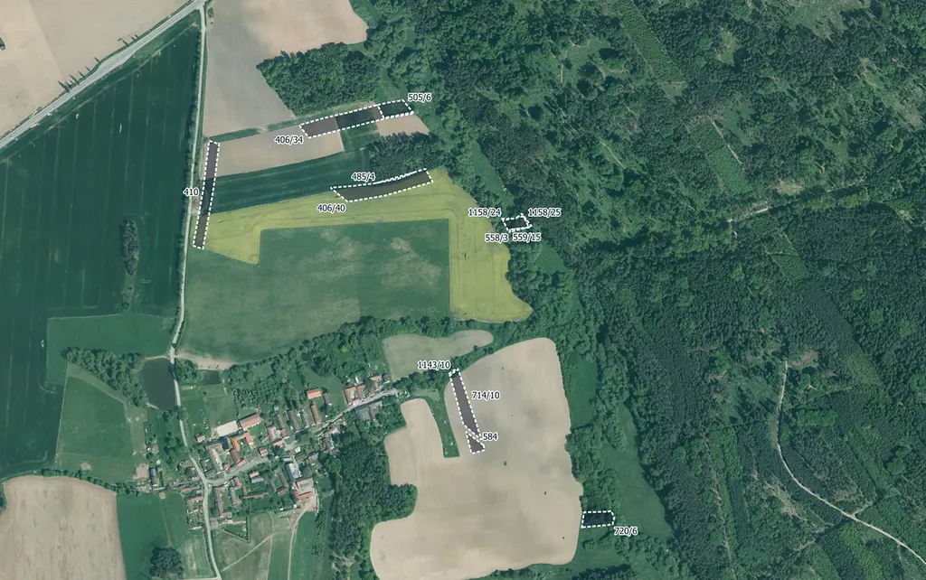 Pozemky jsou vedeny pod čísly 49, 52, 64/1, 100/9, 104/2, 107/1, 160/12, 160/29, 160/30, 168/5, 170/9, 172/2, 182/7, 192/1, 194/6, 406/34, 406/40, 410, 485/4, 505/6, 531/2, 545/3, 558/3, 559/15, 584, 714/10, 720/6, 809/1, 1002/31, 1060, 1061, 1143/10, 1149/3, 1151/13, 1156/28, 1158/24 a 1158/25.