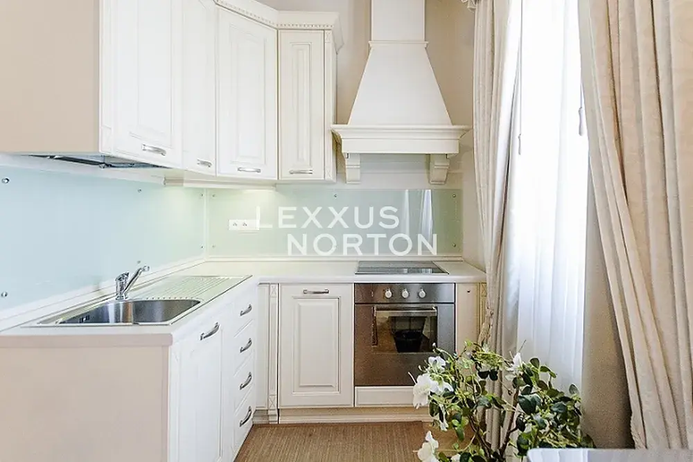 Zařízený byt nabízí plně vybavený kuchyňský kout (sporák, trouba, lednice, mrazák, myčka nádobí), koupelnu s rohovou vanou, obývací pokoj se sedací soupravou a postelí a skříní s úložnými prostory.