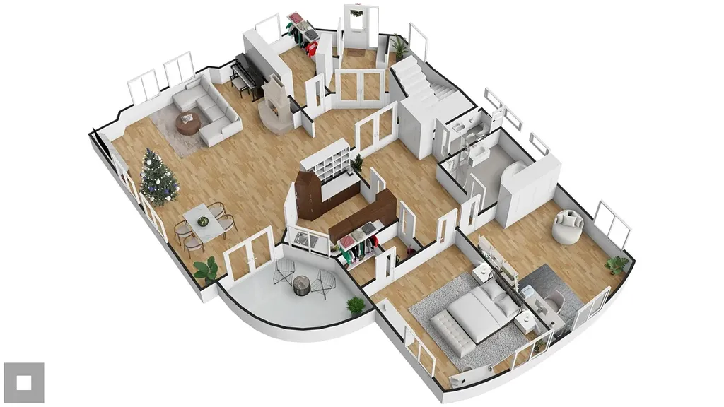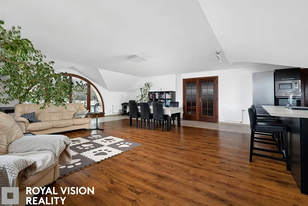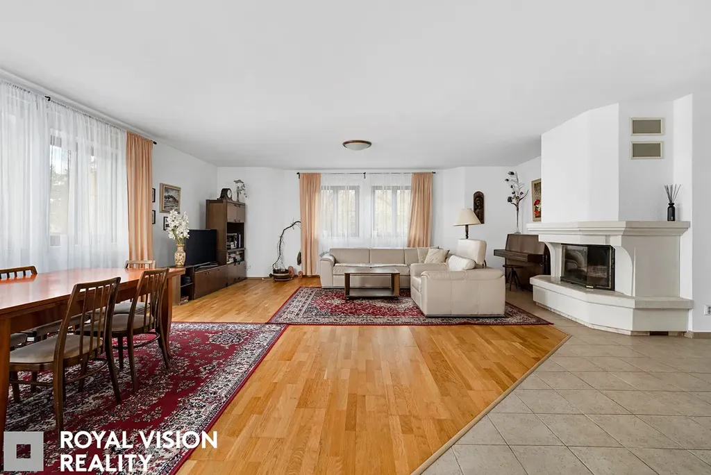 Prostorná vstupní chodba tvoří příjemný vstup do bytu. Dominantou je obývací pokoj s krbem a vstupem na balkon. Kuchyni lze ponechat otevřenou nebo ji uzavřít dveřmi. Byt disponuje velkou chodbou se spoustou úložných prostor, komorou na potraviny, skladem, samostatným WC a koupelnou s vanou i sprchovým koutem. Nechybí ložnice a pracovna.