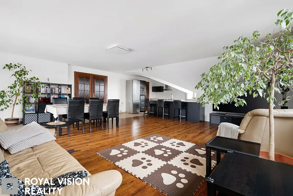 Obývací pokoj je propojen s kuchyní vybavenou praktickým ostrůvkem. Nechybí prostorná chodba, komora, předsíň, ložnice, dětský pokoj a koupelna s vanou, sprchovým koutem a WC. Z bytu je vstup na balkon a přístup do půdního prostoru, který nabízí další úložnou kapacitu.