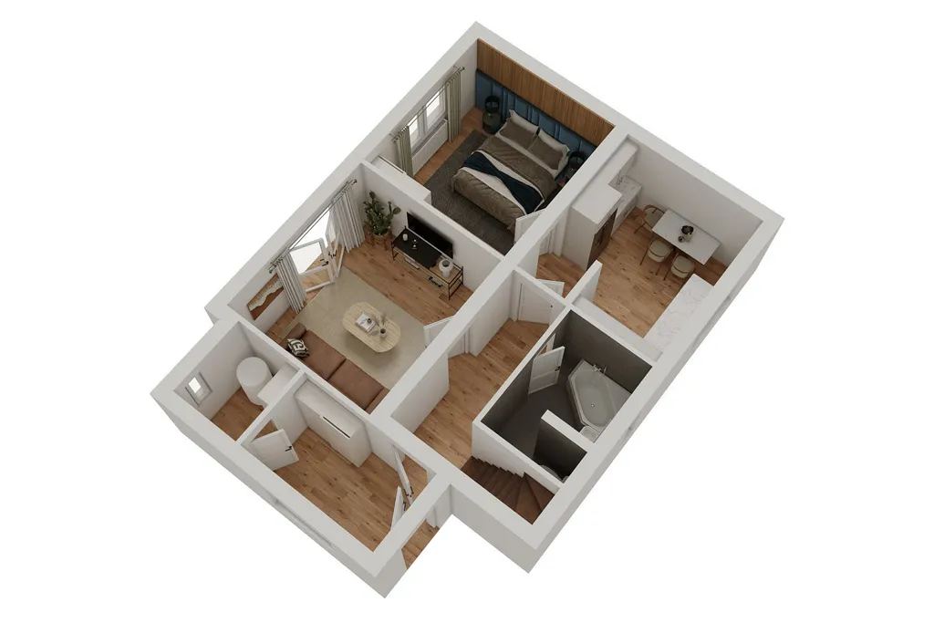 Z chodby vede schodiště do podkroví. Je zde počítáno s vybudováním dvou obytných místností a samostatné toalety. Prostory jsou připravené k dokončení dle vlastních představ. Z podkroví je přístupná také půda, která slouží pouze jako menší úložný prostor.