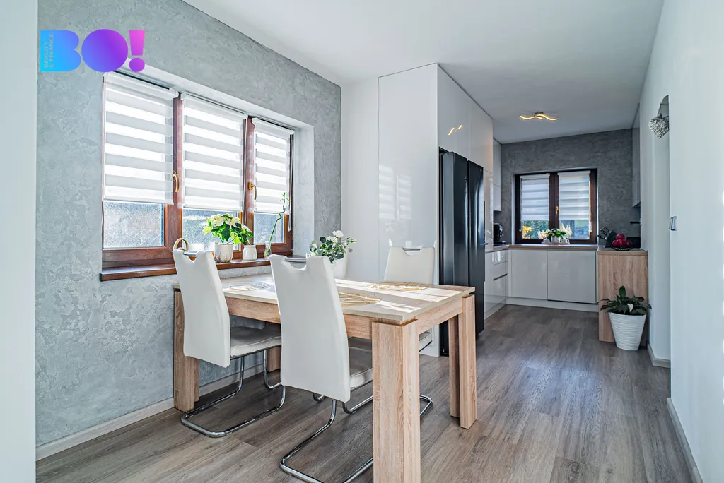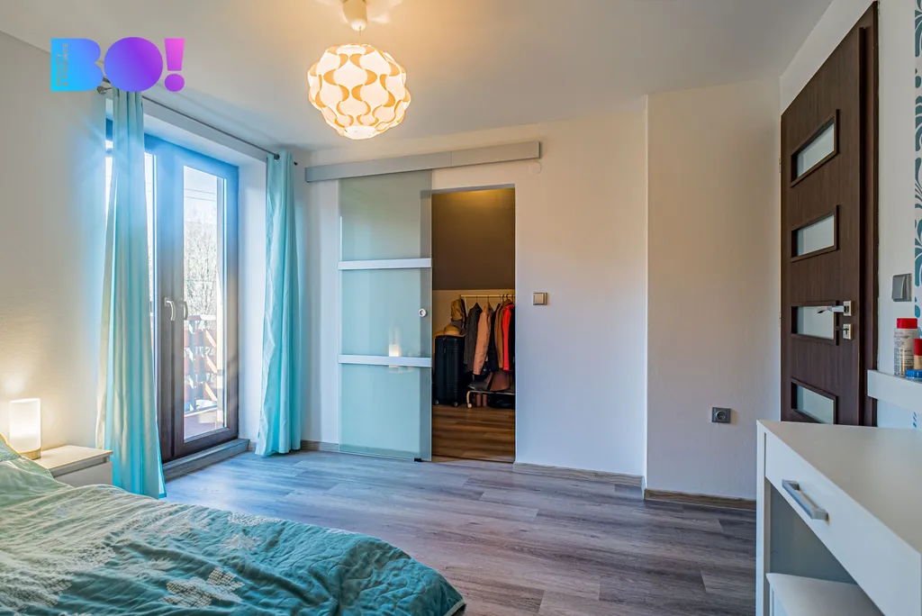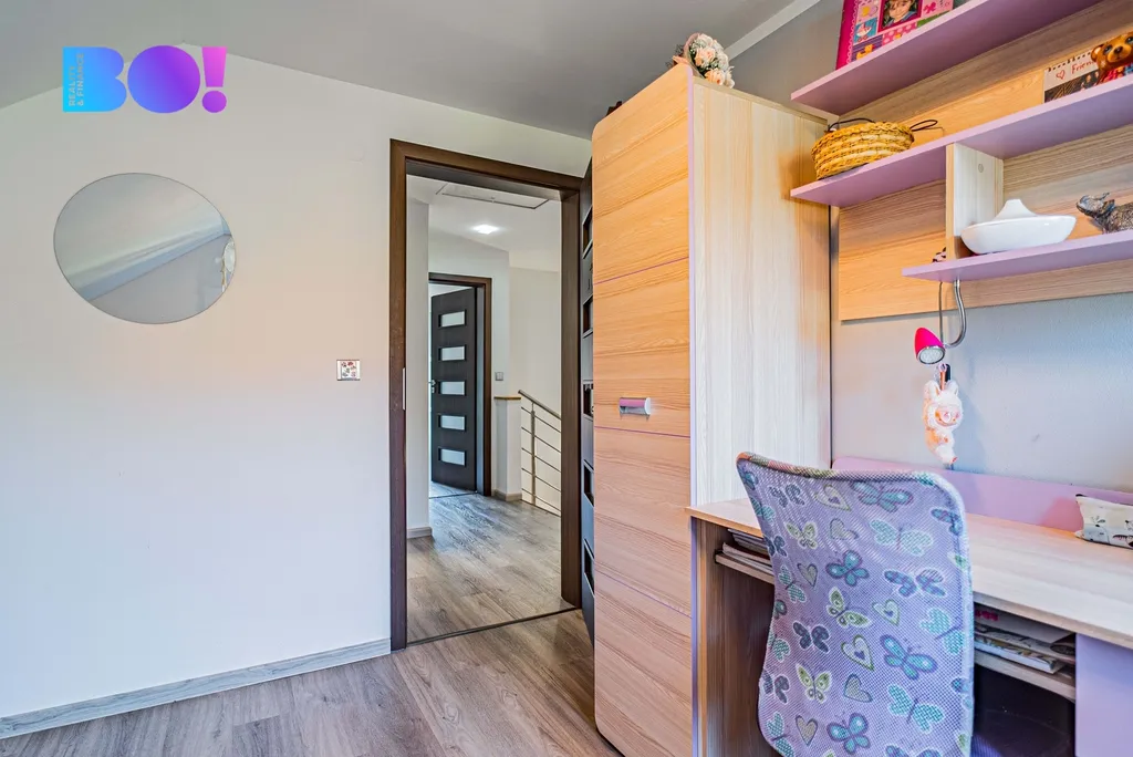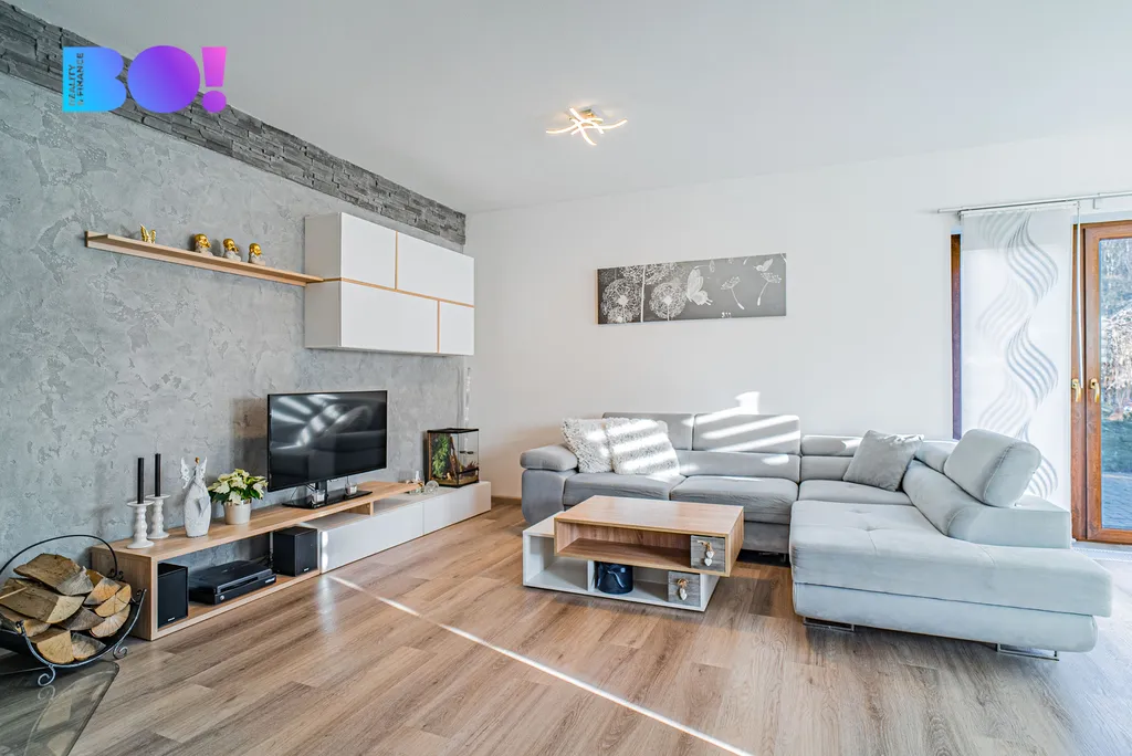 Přízemí domu tvoří prostorný obývací pokoj se vstupem na venkovní terasu, který volně navazuje na jídelní prostor a na novou moderní kuchyň. Kuchyně je kompletně vybavena spotřebiči – indukční varná deska, elektrická trouba, mikrovlnná trouba a myčka. K dispozici je také komora a samostatná toaleta. Podlahy jsou řešeny vinylovou krytinou na klik systém, v koupelně a na WC je položena dlažba. Dřevěné schodiště vede do prvního patra, kde se nacházejí dva dětské pokoje – každý s vlastním balkonem, ložnice se šatnou a balkonem a další pokoj vhodný jako pokoj pro hosty, pracovna nebo budoucí koupelna (příprava je hotová).