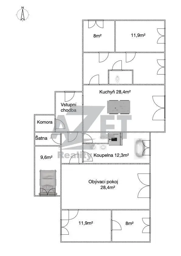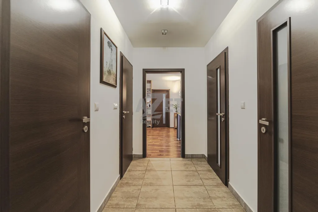 Dispozice bytu je promyšlená a nabízí dostatek soukromí i komfortu v podobě prostorné koupelny s oknem vedle vany a sprchovým koutem, dvě samostatné toalety, 2x komora/šatník a šest pokojů.