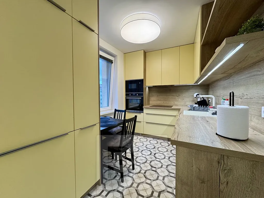 Kuchyně je orientovaná do vnitrobloku, má velké okno, které zajištuje krásné světlo. Kuchyňská linka na míru s vestavěnými spotřebiče nejvyšší kvality. Velká pracovní deska a mnoho skříněk.