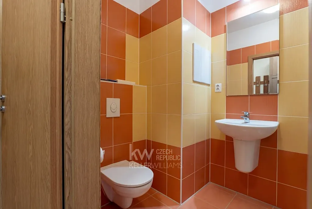- V koupelně je sprcha, toaleta a místo tu má i poloviční pračka s bočním plněním.