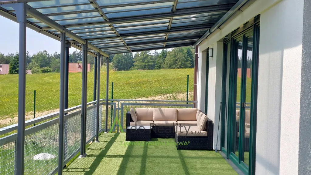 DLOUHODOBÝ PRONÁJEM na dobu určitou 5 let nebo dle dohody, s cílem udělat nájemcům radost, aby přijali a užívali celý dům i s pozemkem jako opravdoví vlastníci. Právě byla dokončena stavba nadstandardních šesti stejných domů u lázeňského městyse Frymburk, na břehu Lipenského jezera. Prezentujeme zde bezbariérový bungalov, který je situován tak, aby prostorná terasa byla orientována jižně, s výhledem na jezero. Tento majitelé nevybavili. Domy byly postaveny za použití nejmodernějších technologií, jsou energeticky velmi úsporné „B“, vytápěné německým tepelným čerpadlem Viessman vzduch-voda, s podlahovým topením v celém domě. V obývacím pokoji se nachází ale i komín jako příprava pro krbová kamna nebo krb. Stavba je zděné konstrukce Porotherm 30 cm, zdi jsou izolovány 15 cm polystyrénem, stropní izolace je 18 cm, okna jsou trojitě zasklená a před všemi jsou instalovány rolety s elektrickým ovládáním. Střecha je valbové konstrukce a krytina keramická německého výrobce Roben. Půda je přístupná po skládacím schodišti. Dispozičně je dům řešen takto: Ložnice rodičů, která má k dispozici vlastní koupelnu se sprchovým koutem a WC s bidetovým mechanizmem, dále prostorný obývací pokoj s vybavenou kuchyní Schüller, jejíž pracovní deska se dřezem Blanco, se skříňkami a spotřebiči Elektrolux zabírá celou délku místnosti. Je provedena příprava napojení vody a elektro na americkou lednici s výrobníkem ledu. V tomto pokoji je právě možnost nainstalovat jednoduše krbová kamna a tak si zajistit ve studených dnech příjemnou atmosféru. V druhé části domu jsou další dva pokoje, z nichž lze rovněž vyjít na prosluněnou terasu. Na konci chodby je pak samostatné WC s malým umyvadlem a poslední, ale neméně důležitou místností je parádní koupelna s volně stojící vanou, sprchovým koutem a umyvadlem. Před hlavními vstupními dveřmi je ochranné zádveří, kde je venkovní jednotka TČ a také provedena příprava elektro na možnost instalace auto nabíjecí stanice, z něhož je teprve vstup do domu. Zde je úschovný prostor, je tu místo na velkou odkládací skříň a je odtud vstup do technické místnosti. Ta může také skrývat další pohodlnou skříň pro ukládání potřebných věcí, hlavně je zde vnitřní jednotka tepelného čerpadla, dále pak tlaková nádrž s ovládáním čerpání vody a také moderní úpravna vody Watex, která zajistí tu nejkvalitnější pitnou vodu. Zbývá zde ještě dost místa pro pračku a sušičku. Největší devizou tohoto domu je velká venkovní terasa cca 40 m2 s krásným výhledem, která je ze dvou třetin krytá variabilní odsouvací střechou. Tato terasa je propojena se všemi obytnými místnostmi domu. Dešťová voda je svedena do podzemní retenční nádrže o obsahu 4000 litrů s možným využitím k zalévání. Parkování je řešeno pro dvě auta na vlastním pozemku u domu. Každý dům má své vlastní zabezpečovací zařízení Jablotron, napojené na pult ochrany s výjezdem. Připojení internetu zajišťuje Starnet. K pronájmu je připraveno nyní pět plně dokončených domů, které po dohodě můžete mít zařízeny a nebo si je můžete zařídit nábytkem dle svých představ. Celý oplocený areál je v mírném svahu pod lesem, v okolí je krásná čistá příroda. Relaxovat se dá v letním období, vodními sporty, cykloturistikou kolem přehrady, houbaření a výšlapy po šumavské přírodě. V zimním období se nabízí běžkování a sjezdové lyžování na Lipně, v Rakousku a Německu. K břehu Lipenského jezera dojdete pěšky za méně než 5 minut, Český Krumlov je vzdálen 30 km, České Budějovice 55 km, přívozem přes vodu na hraniční přechod do Rakouska Guglwald 7 km. Další podrobnosti Vám rádi sdělíme při osobním jednání.