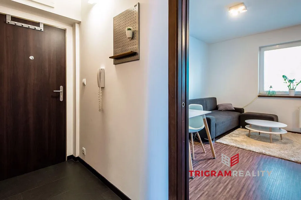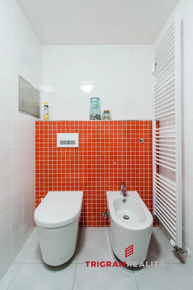 Byt působí světlým, příjemným a harmonickým dojmem. Dispozice je promyšlená – prostorná předsíň nabízí dostatek úložného prostoru, koupelna je vybavena vanou, toaletou, bidetem i místem pro pračku a sušičku.