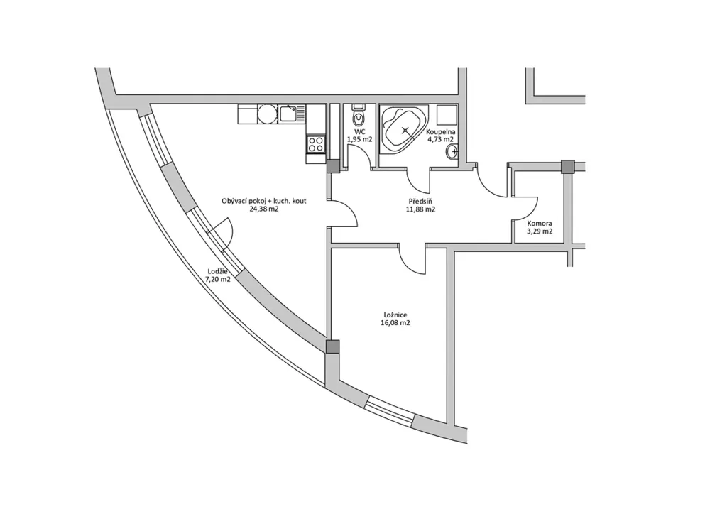 Obývací pokoj s kk 24,38m2, ložnice 16,08m2, předsíň 11,88m2, koupelna 4,73m2, WC 1,95m, komora 3,29m2, lodžie 7,2m2, sklepní kóje 2,8m2. CELKEM 72,31m2.