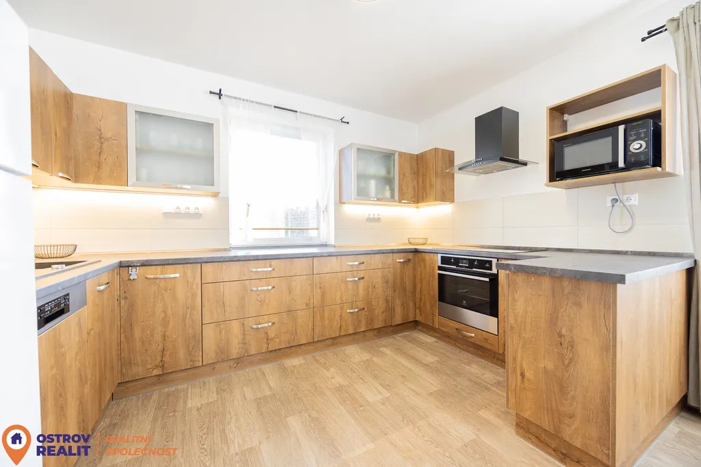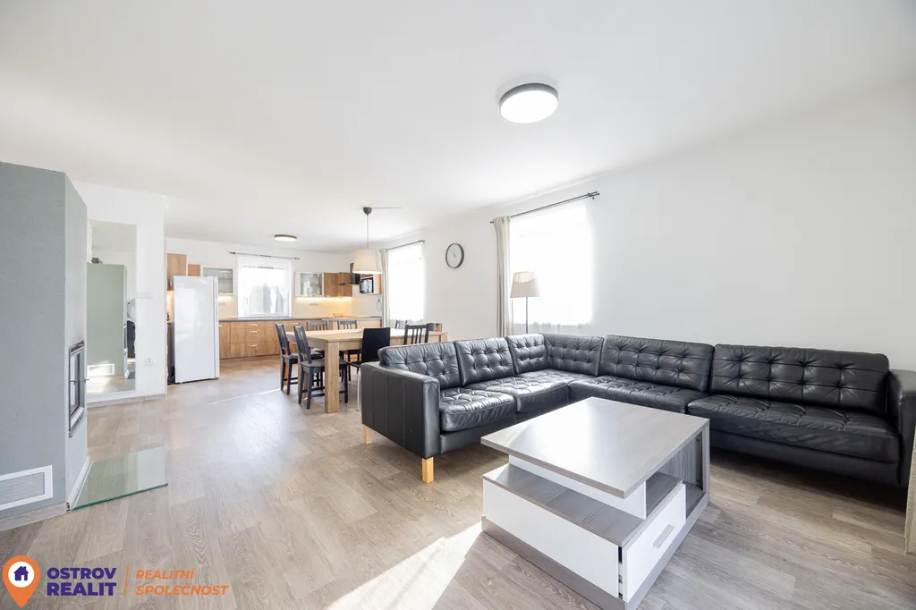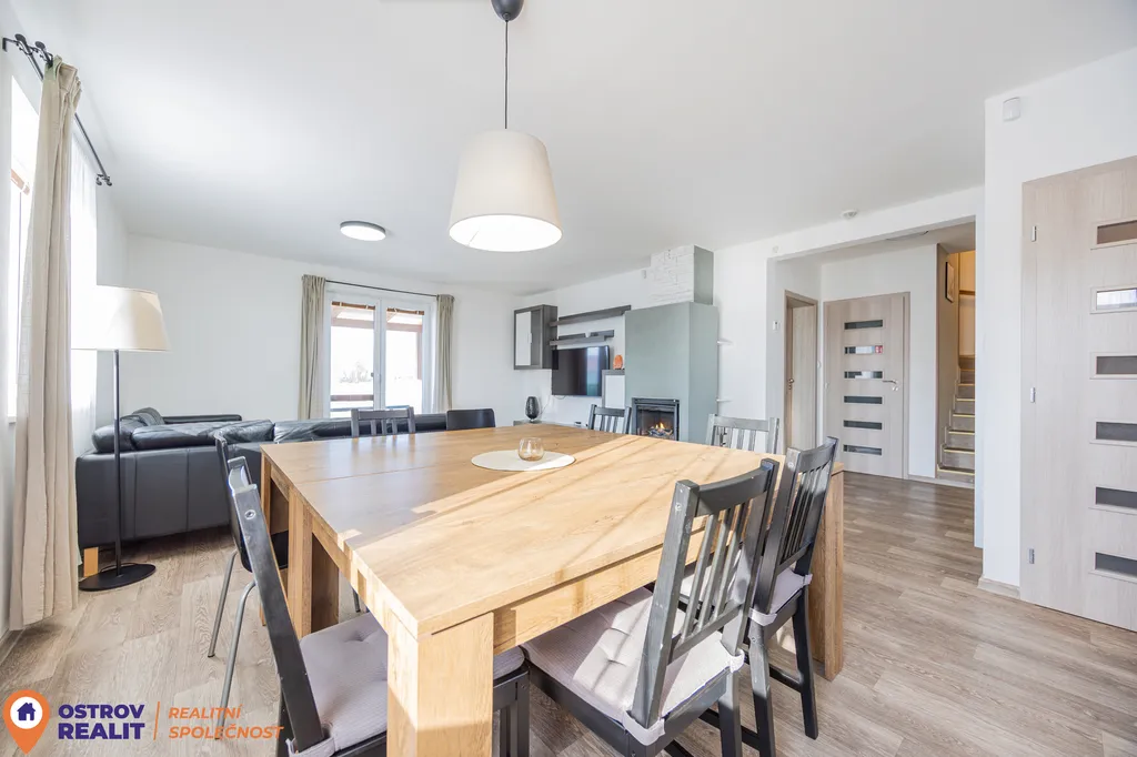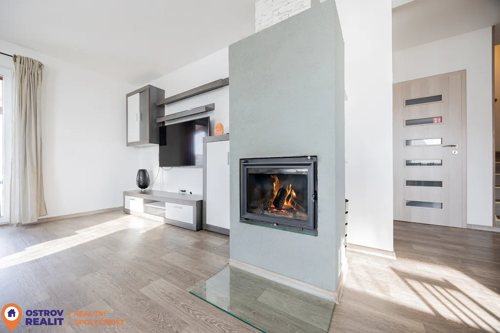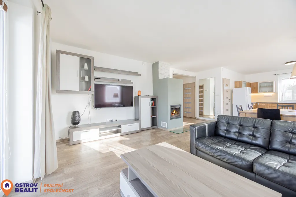 Dominantou interiéru je prostorný obývací pokoj propojený s kuchyní, jehož přirozeným centrem je krb. Ten vytváří příjemnou atmosféru domova a zároveň přispívá k nízkým nákladům na vytápění. Z obývací části je přímý vstup na terasu a zahradu, odkud se otevírají krásné výhledy do okolní krajiny. Velká okna zajišťují dostatek denního světla po celý den.