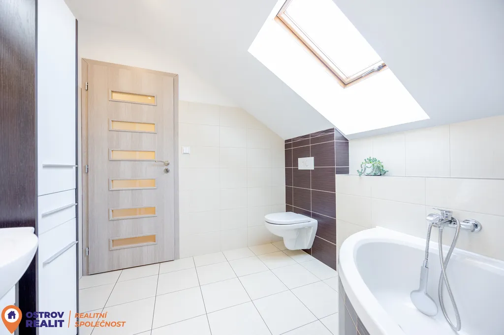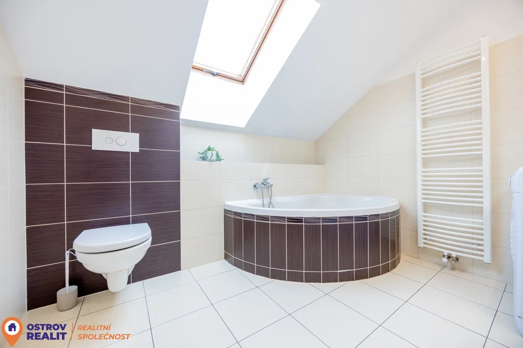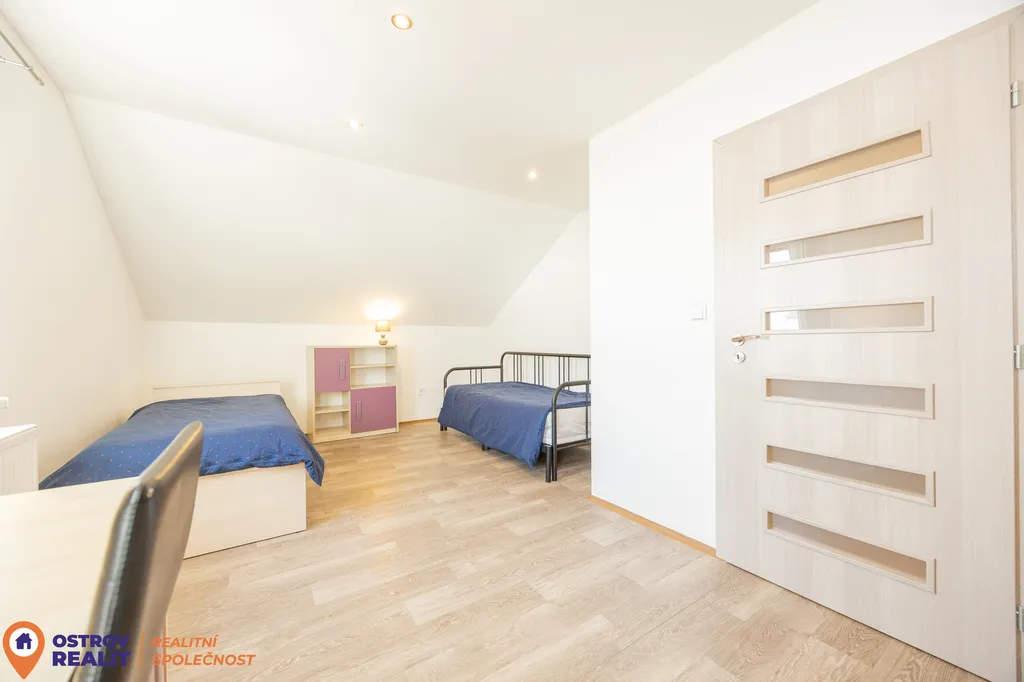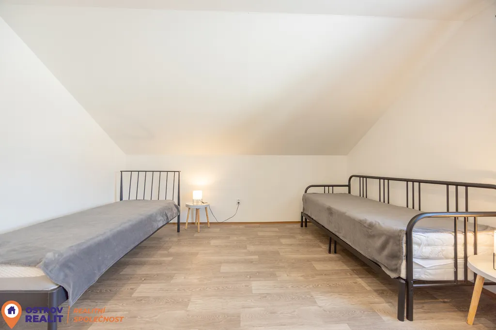 Ve druhém nadzemním podlaží je k dispozici koupelna s rohovou vanou a WC, tři samostatné neprůchozí pokoje a šatna. Dispozice domu je velmi praktická a vyhoví jak rodinnému bydlení, tak i rekreačnímu využití.