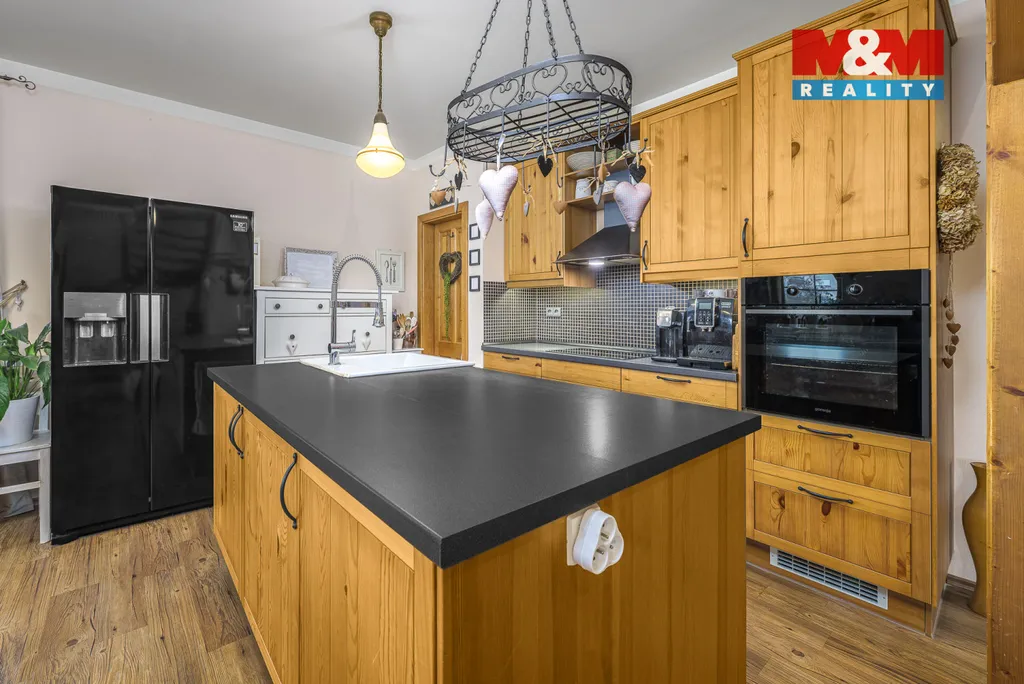 Dům je vybaven krbovými kamny, a velkým bonusem je krytá terasa s výhledem do přírody.