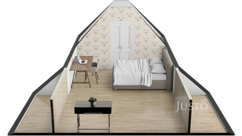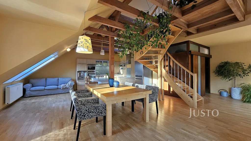 Dominantou bytu je reprezentativní obývací pokoj s jídelní částí a kuchyňským koutem, který tvoří přirozené srdce domova. Z obývacího pokoje vede elegantní schodiště do mezonetu, kde se nachází samostatná ložnice se šatnou – ideální jako rodičovská zóna, pracovna nebo pokoj pro hosty.