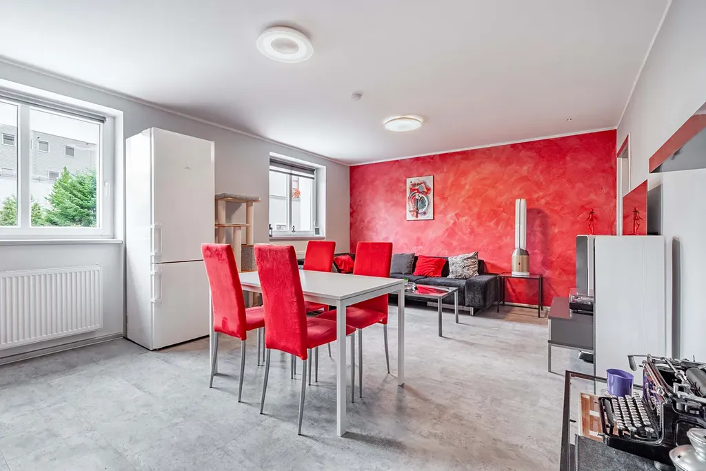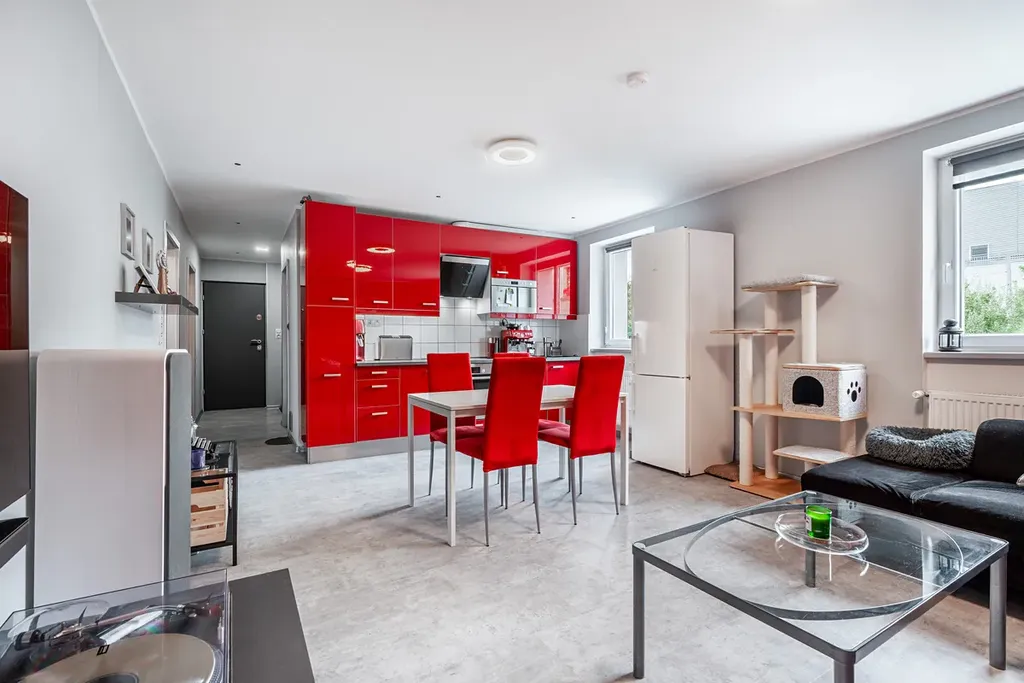 Byt nabízí velkorysý obývací prostor s kuchyňským koutem, který tvoří přirozené centrum bydlení. Moderní kuchyňská linka má dostatek úložného prostoru s vestavěnými spotřebiči.