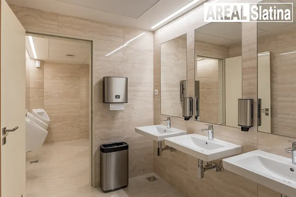 - Zdravé pracovní prostředí vytvořené bezprůvanovou klimatizací chladícími trámy s filtry F9, parním zvlhčováním vzduchu a regulací CO2; trojskla se solární ochranou