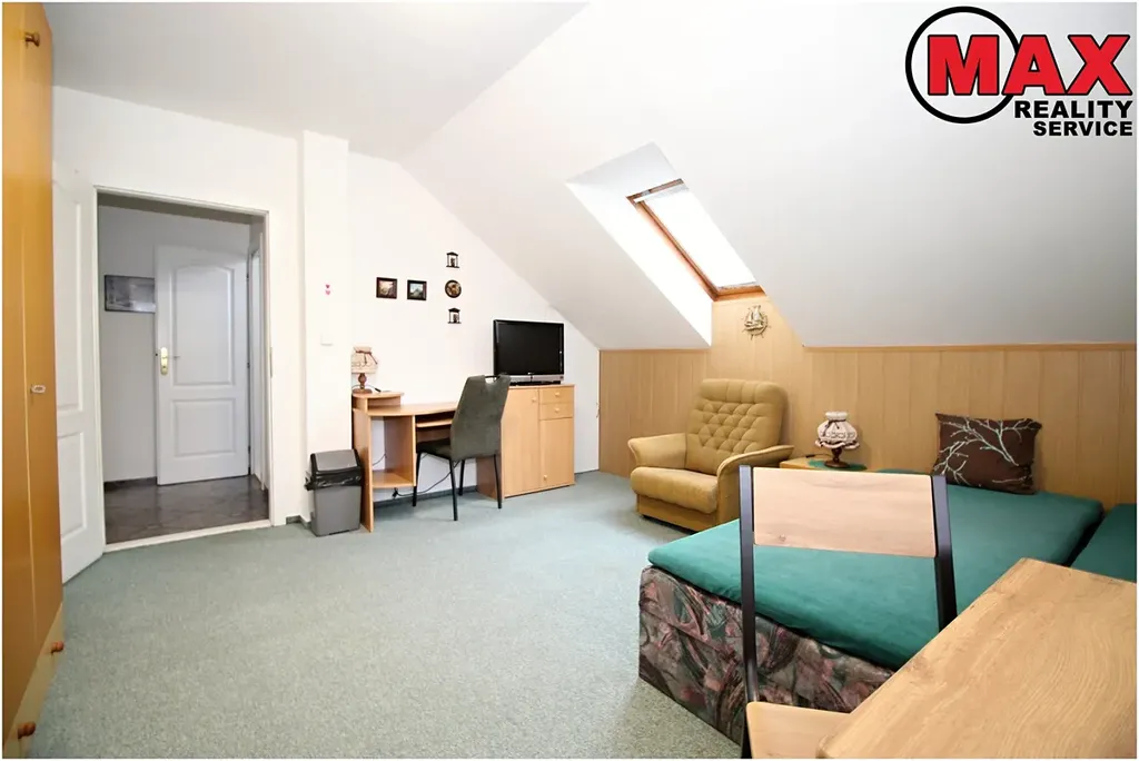 Vstup do domu je hlavními dveřmi ihned na schodiště, pokoj o velikosti cca 20 m2 vybaven: 2x válendy, křeslo, jídelní stolek a židle, PC stolem, prostorná skříň, úložný prostor, dále se v pokoji nachází malá lednice, el. vařič, mikrovlnná trouba, rychlovarná konvice, televize, připojení k internetu přes wifi.