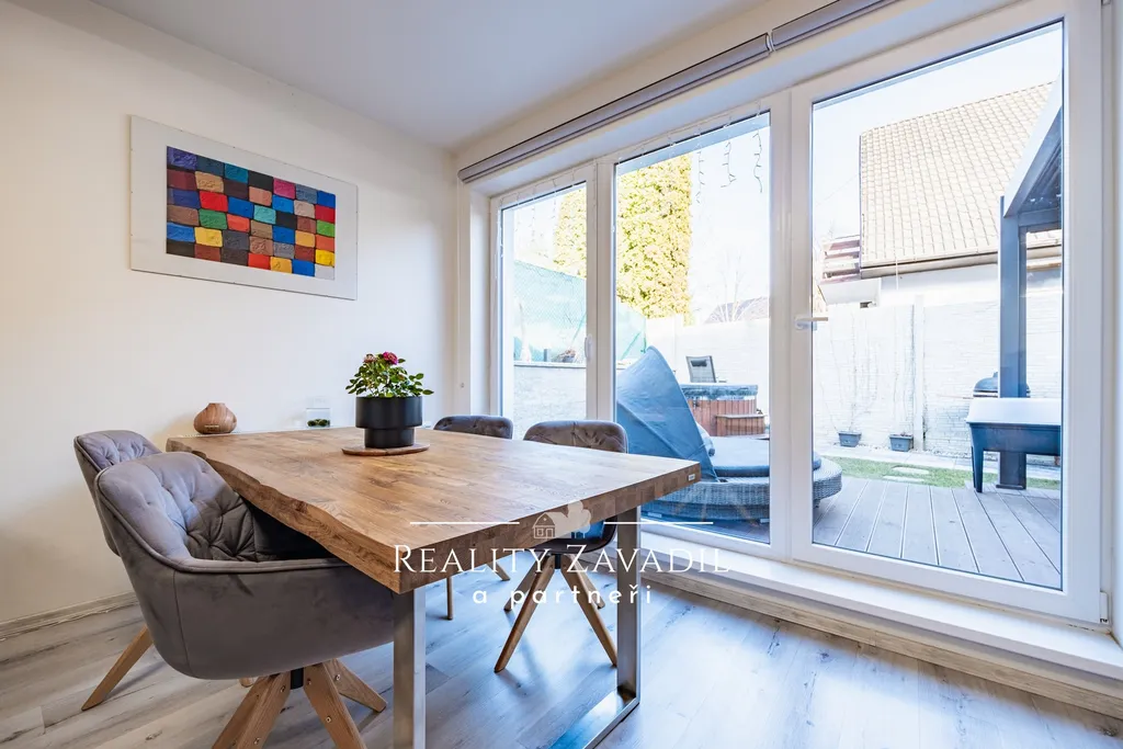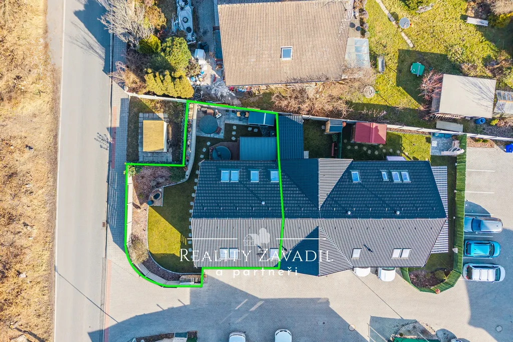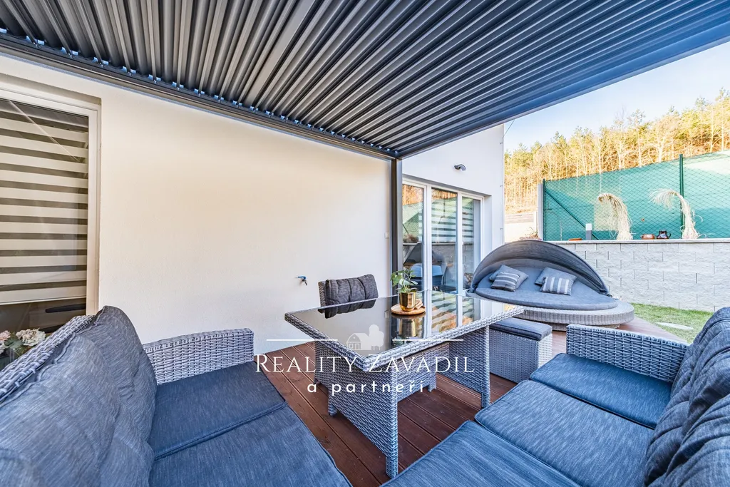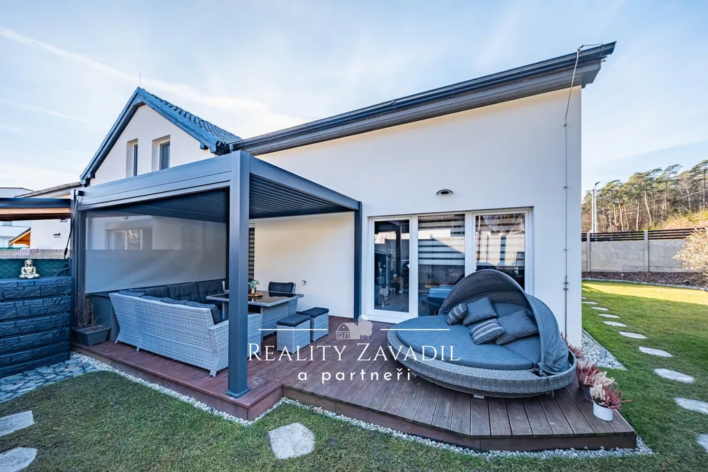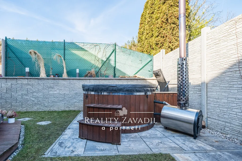 K domu náleží oplocená zahrada o výměře 152 m². Zahrada je vybavena bioklimatickou pergolou a vířivkou vhodnou pro celoroční využití.