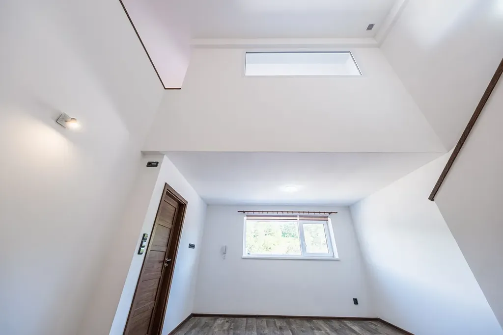 sprchovým koutem, wc a místem pro pračku a sušičku, dále pak jdeme do obytné místnosti s velkým otevřeným stropem a