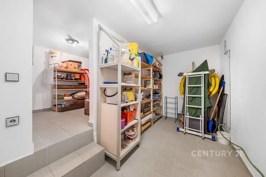 V přízemí (1. NP) se nachází samostatná obytná jednotka s obývacím pokojem a kuchyňským koutem, pracovna, koupelna a technické zázemí. Součástí je také prostorná garáž o výměře 33,6 m².