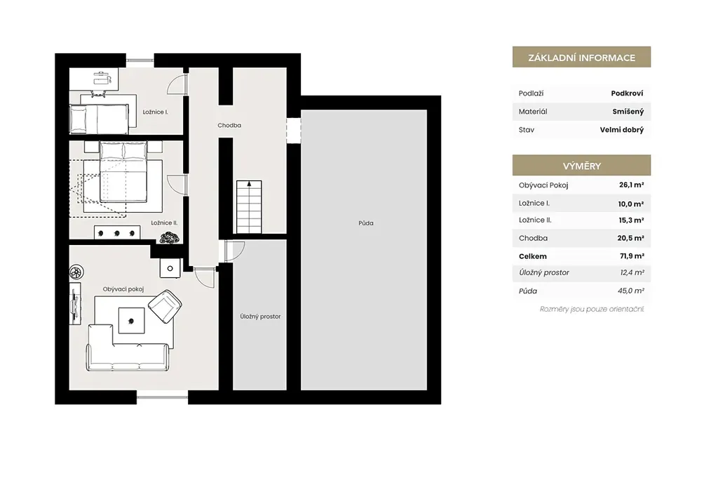 Podkroví je aktuálně využíváno jako půdní prostor s několika místnostmi. Díky své velikosti a konstrukci nabízí možnost vybudování plnohodnotného obytného patra dle vlastních představ.