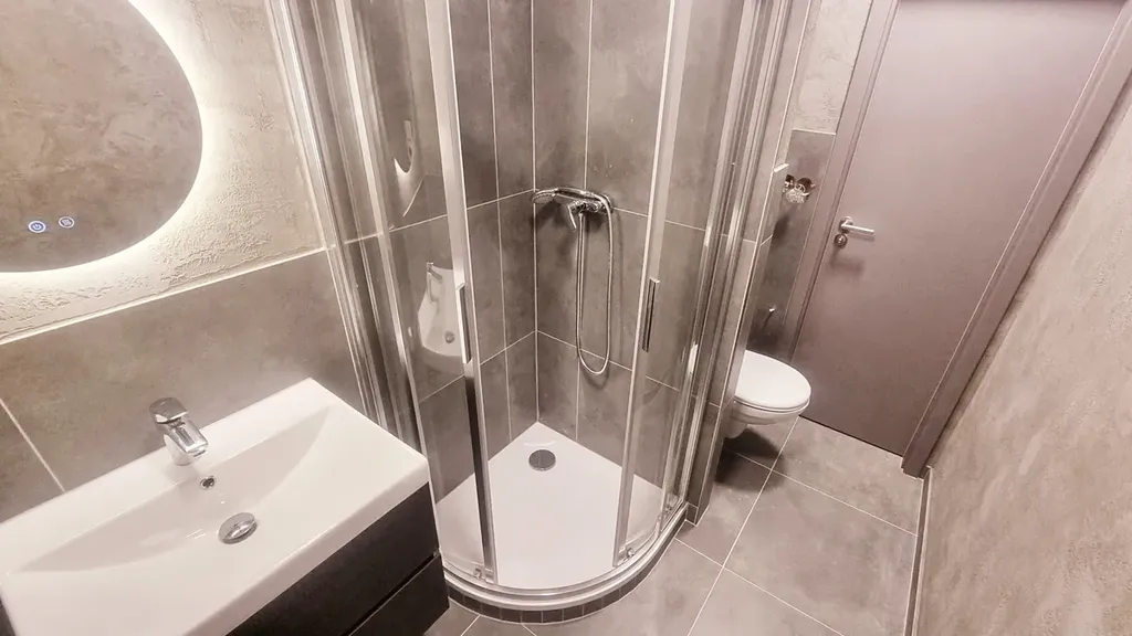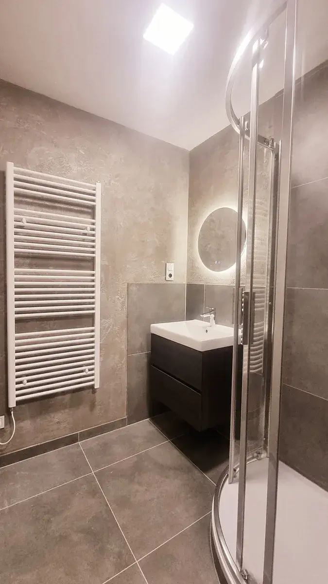 V koupelně (4 m²) je sprchový kout, umyvadlo, podsvícené zrcadlo, otopný žebřík a toaleta.
