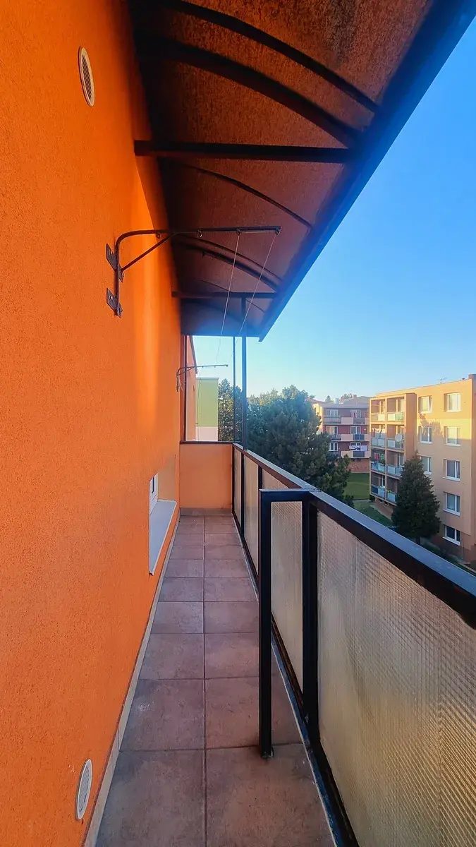 Odsud se vstupuje na krytý balkón (5,5 m²) s nástěnným sušákem.