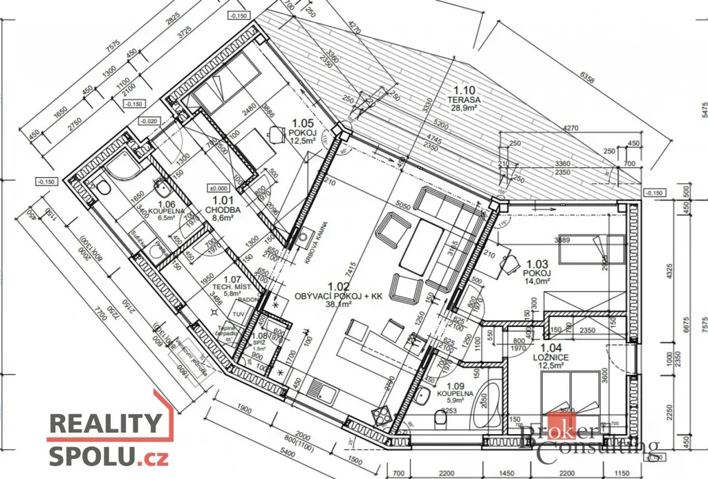Domy v projektu Terasy Rokycany budou realizovány jako přízemní bezbariérové bungalovy s ideální dispozicí pro čtyřčlennou rodinu. Obytný prostor s podlahovou plochou 109,6 m2 plynule naváže na zastřešenou terasu o ploše 28,9 m2 přístupnou přes velké prosklené portály, které propojí interiér s exteriérem a umožní téměř celoroční život venku.