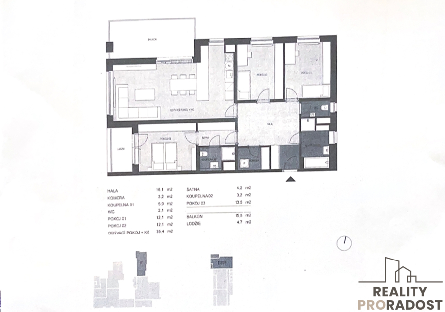 Balkon: 15,5 m² (zastřešený, přístup z obývacího pokoje)