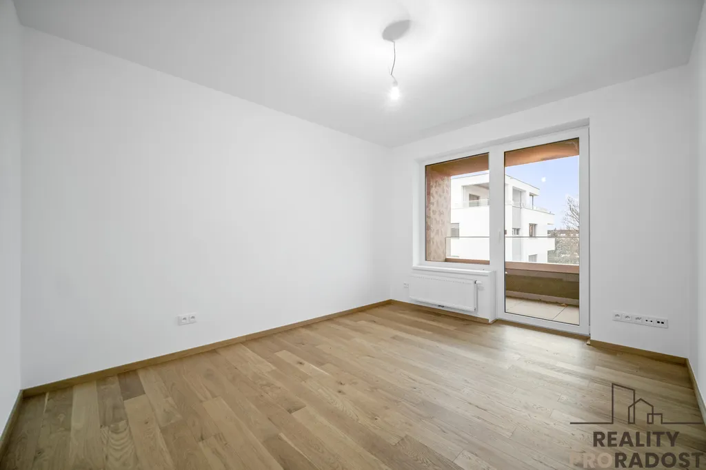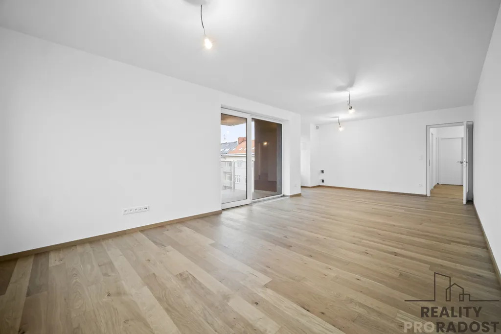 Z hlavní chodby je také vstup do velkorysého obývacího pokoje s kuchyňským koutem, kde dominují velká prosklená okna a francouzské dveře vedoucí na prostorný, zastřešený balkon o výměře 15,5 m², ideální pro posezení a relaxaci.