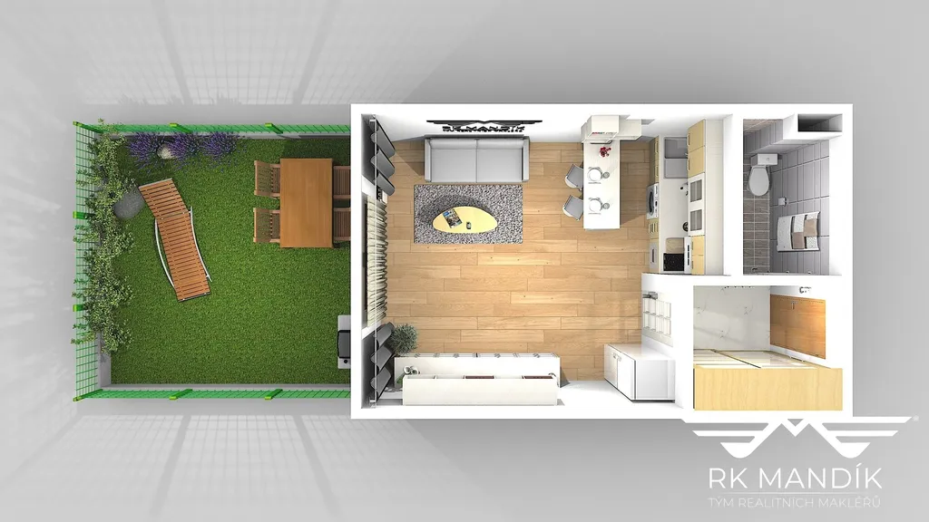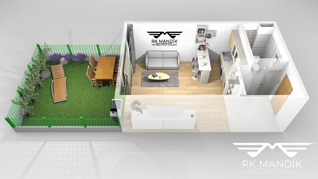Dispozice je prakticky řešená a působí vzdušně. Hlavní obytný prostor s kuchyňským koutem má 22,05 m². Kuchyňská část je vybavena zcela novou elektrickou varnou deskou (dvoj-plotýnka), elektrickou troubou, digestoří, lednicí s kombinovaným mrazákem a pračkou. V obytné části je instalováno menší patro na spaní, které je možné po předchozí domluvě demontovat. Z pokoje je přímý vstup na příjemnou, oplocenou zahradu ve vlastním užívání – ideální pro posezení, zeleň a každodenní relax bez nutnosti jezdit „na vzduch“ mimo domov.