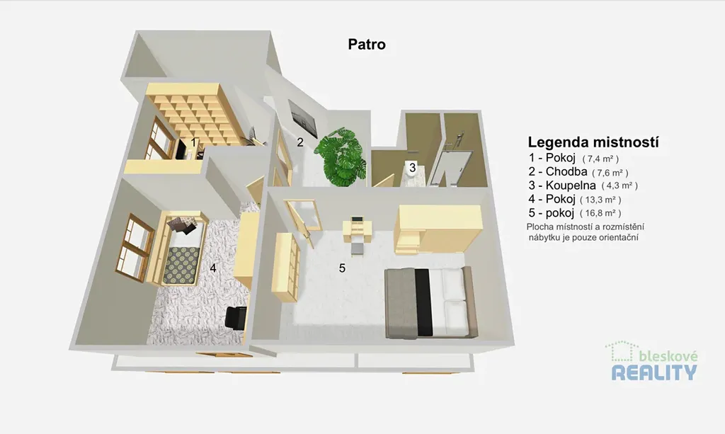 V horním patře se nacházejí tři samostatné, neprůchozí pokoje a druhá koupelna se sprchovým koutem a toaletou. Nad patrem je k dispozici půdní prostor sloužící jako úložné místo.