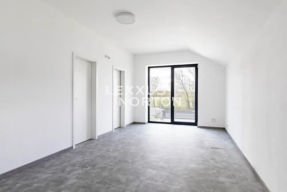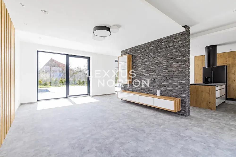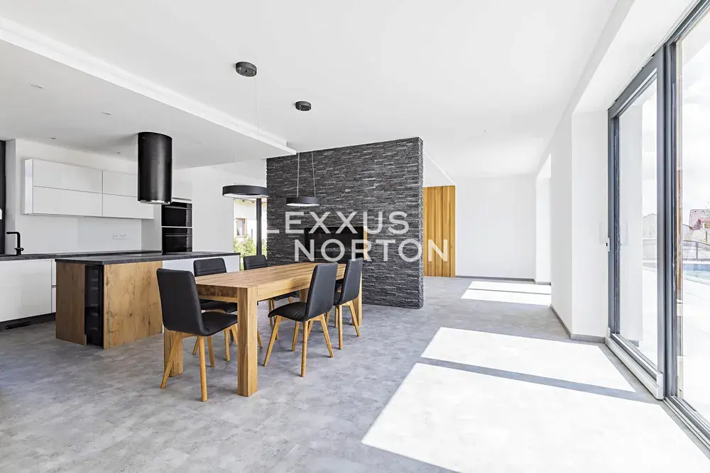 Tento rodinný dům k pronájmu se skládá ze 2 podlaží. V přízemí se nachází vstupní hala, obývací pokoj s krbem a přímým vstupem na terasu a do zahrady, kuchyňský kout s kuchyňským ostrůvkem propojený s jídelní částí, ložnice, samostatná toaleta, technická místnost, komora a relaxační spa & wellness zóna se saunou a masážní vanou. V prvním patře jsou situovány 3 ložnice, koupelna a prádelna. K nemovitosti náleží garáž pro dvě vozidla a jedno kryté venkovní parkovací stání.
