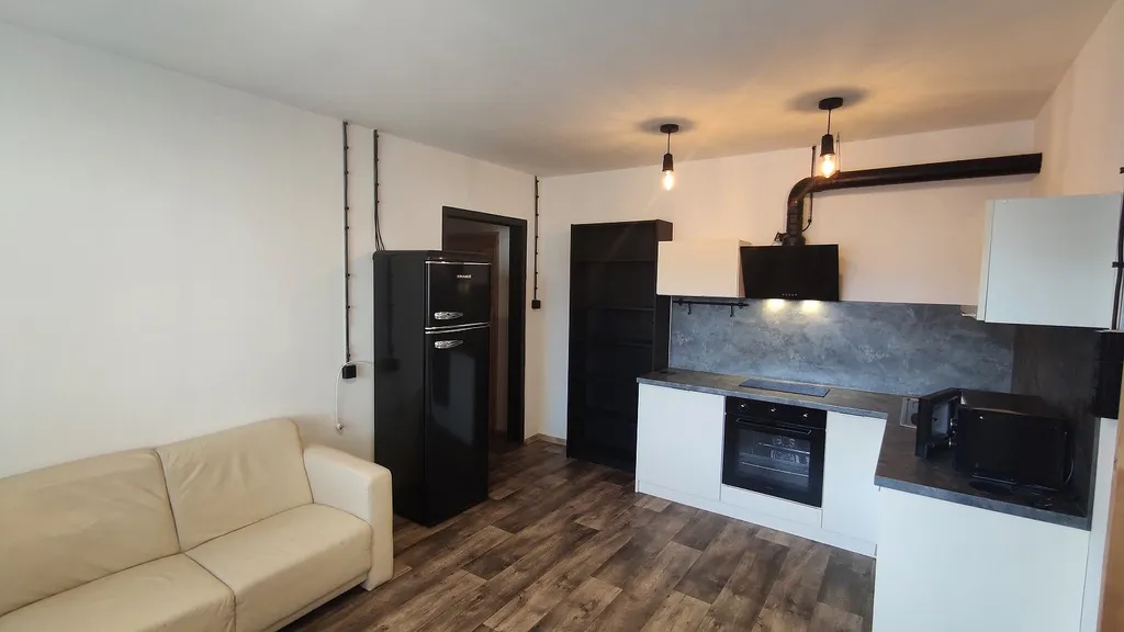 Interiér bytu má atypickou dispozici a působí velmi vzdušně a čistě. Kontrast černých prvků a designových doplňků podtrhuje industriální charakter bytu. Kuchyňská linka je plně vybavena. K dispozici je varná deska s digestoří, klasická i mikrovlnná trouba.