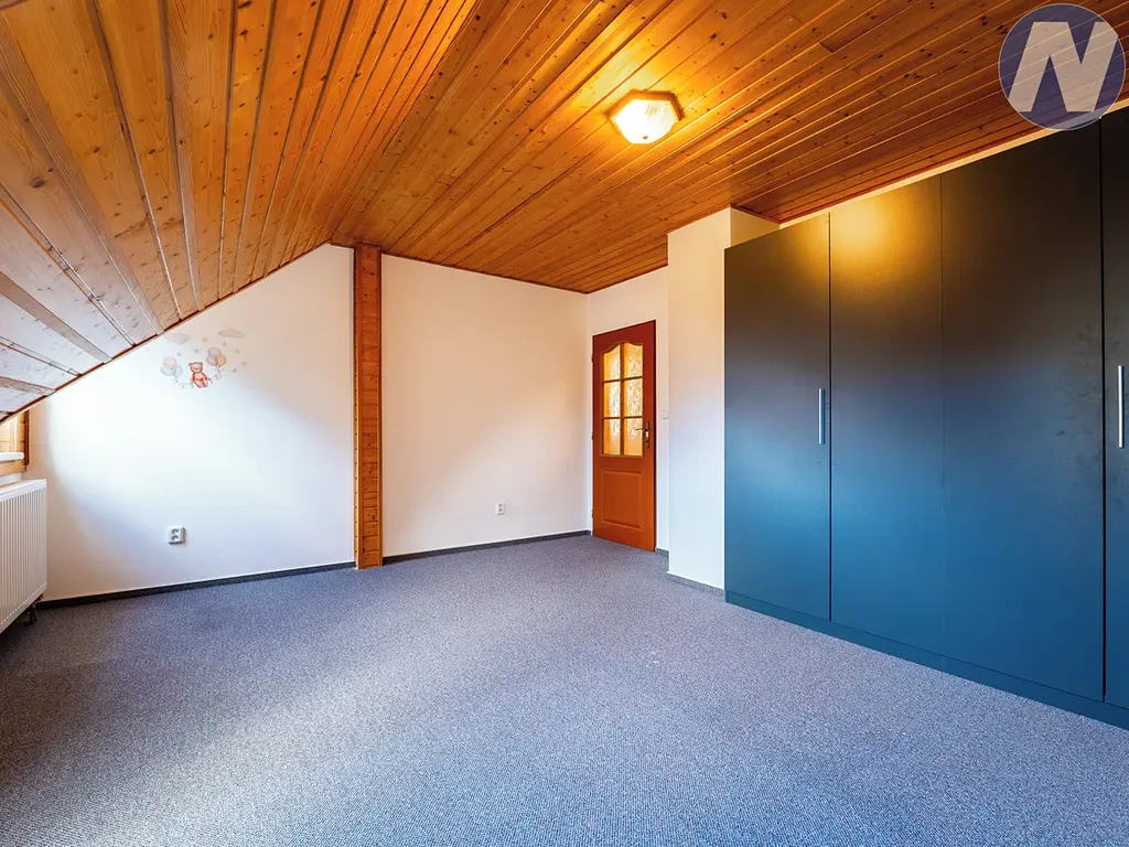 V patře jsou umístěny tři samostatné pokoje, koupelna se sprchovým koutem a toaletou. K dispozici je také půdní prostor 32 m2, který nabízí možnost vybudování dalšího pokoje nebo pracovny.