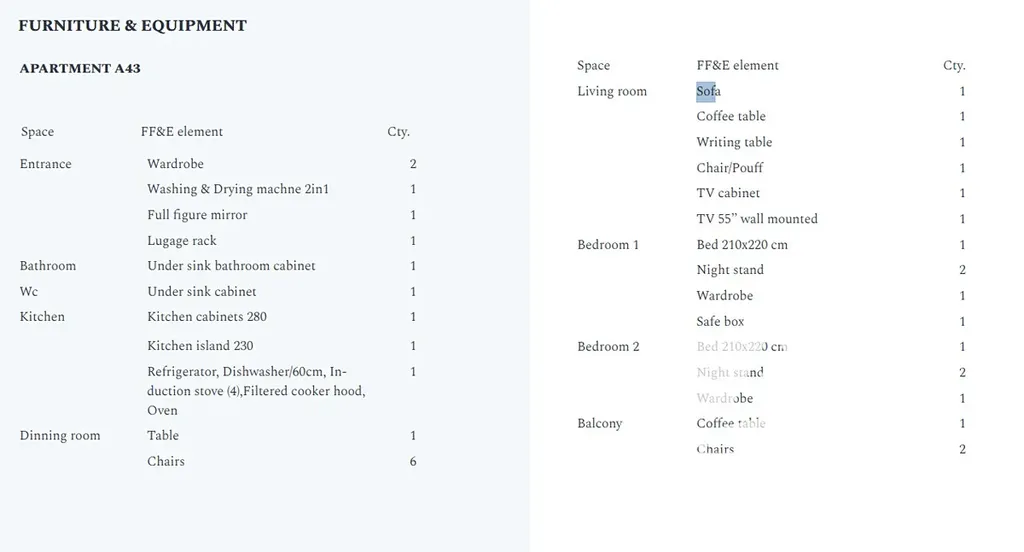 Celková plocha jednotky činí 91,8 m², k níž náleží prostorná terasa o velikosti 25,5 m² s úchvatným výhledem na Jaderské moře. Interiér je zařízen moderním a vkusným nábytkem, který podtrhuje kvalitu a styl celého prostoru.