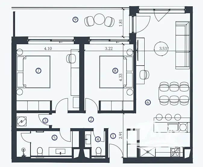 Celková plocha jednotky činí 95,4 m², k níž náleží prostorná terasa o velikosti 15,20 m² s úchvatným výhledem bazén. Interiér je kompletně vybaven moderním, kvalitním nábytkem, který podtrhuje styl i komfort bydlení.