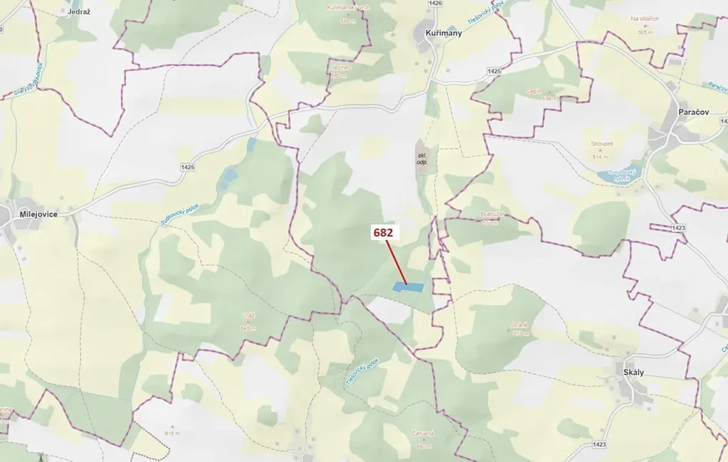 Lesní pozemek o výměře 11 584 m2, parcelní číslo 682, podíl 1/1, katastrální území Kuřimany, obec Kuřimany, obec s rozšířenou působností Strakonice, okres Strakonice, Jihočeský kraj. Po těžbě.