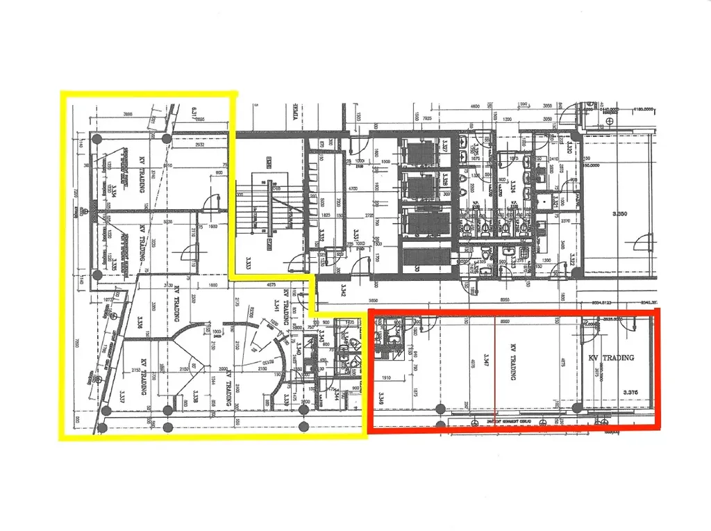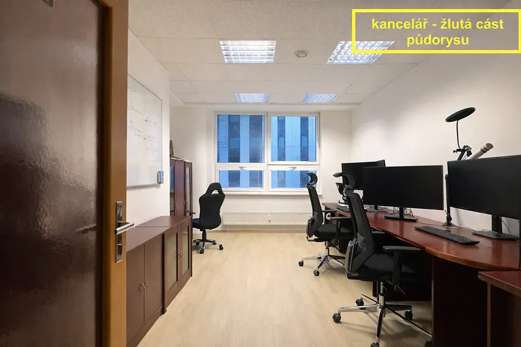 Prostory jsou flexibilně řešené a tvořené dvěma samostatnými částmi dle půdorysu, které lze podnajmout jako celek nebo samostatně (žlutá část na půdorysu).